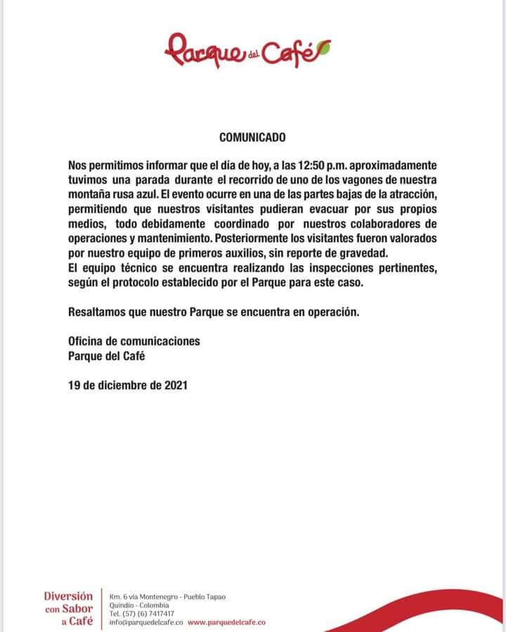 El Parque del Café informó por medio de un comunicado que la montaña rusa fue cerrada mientras arreglaban esta falla mecánica y que las demás atracciones siguen funcionando.