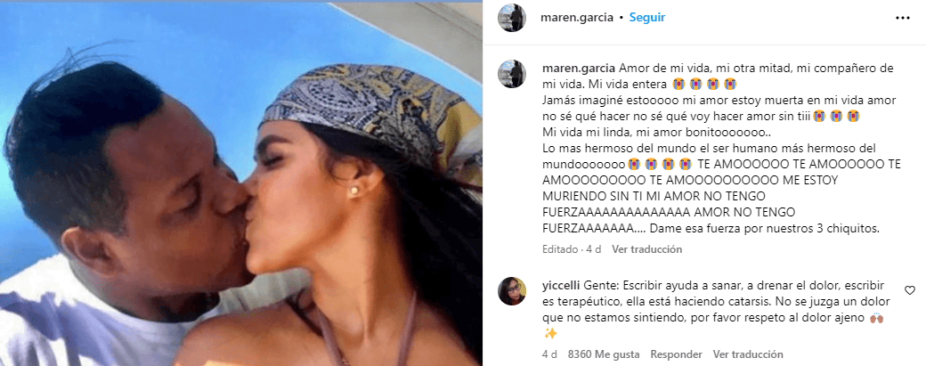 «Amor de mi vida, mi otra mitad, mi compañero de mi vida. Mi vida entera. Jamás imaginé estooooo mi amor estoy muerta en mi vida amor, no sé qué hacer no sé qué voy hacer amor sin tí. Mi vida mi linda, mi amor bonitooooooo. Lo más hermoso del mundo, el ser humano más hermoso del mundooooooo», escribió ella en su perfil de Instagram, como descripción de una foto en la que aparecen dándose un beso.