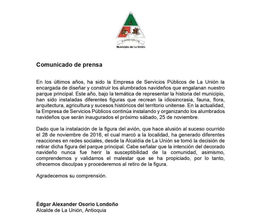 En el municipio de La Unión-Antioquia la empresa de servicios públicos generó una gran polémica, porque dentro del alumbrado navideño que colocó en plazas, parques y demás espacios públicos, incluyó un avión siniestrado alusivo a la tragedia del equipo de fútbol Chapecoense.