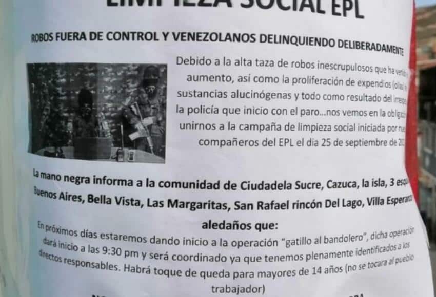 En el panfleto que circula se mencionan los barrios de: Ciudadela Sucre, Cazuca, Buenos Aires, Bella Vista, Las Margaritas, San Rafael, Rincón del Lago, Villa Esperanza y sectores aledaños. En ellos advierten que se hará «plan gatillo al bandolero», después de las 9:30 p.m.