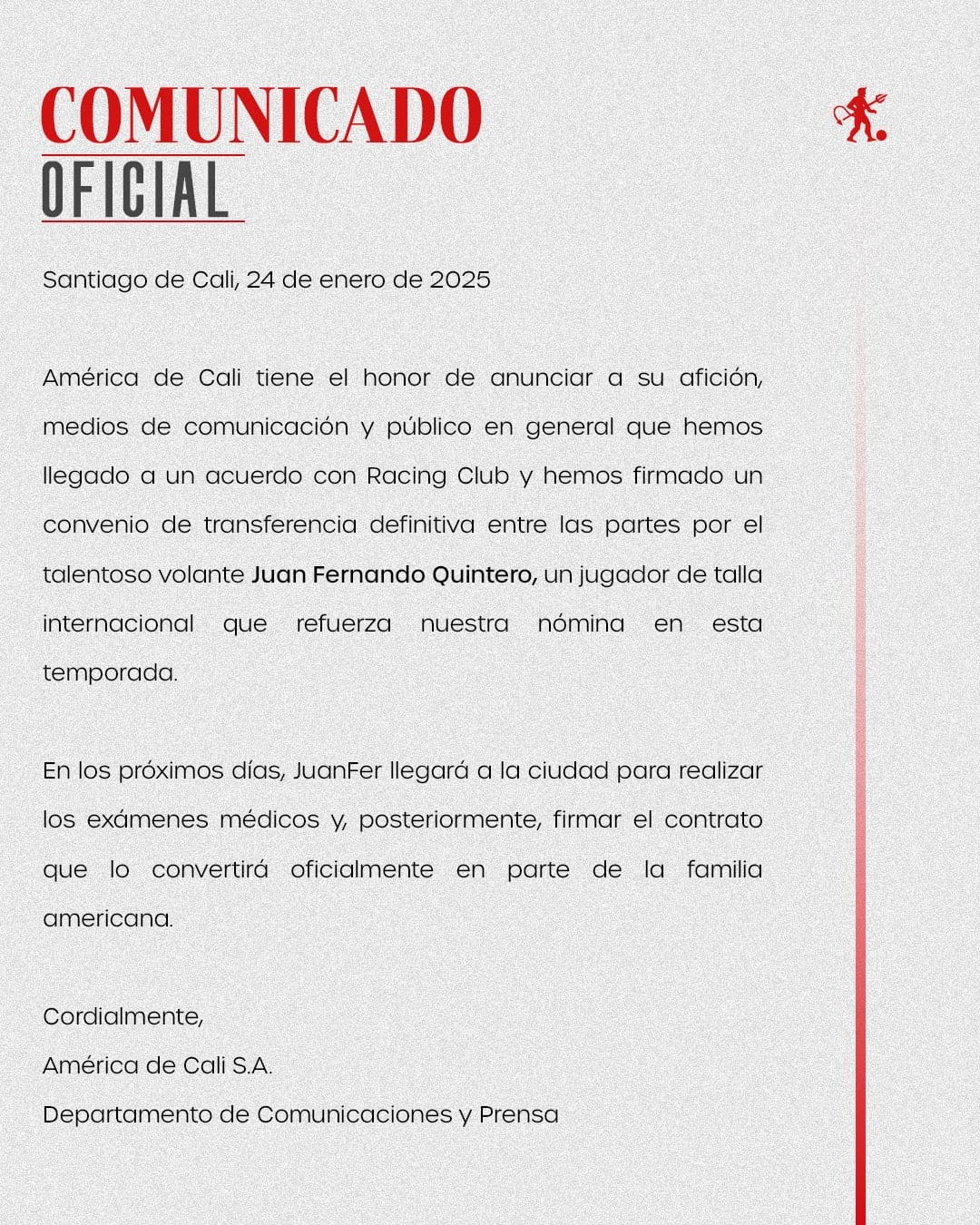 El club escarlata, que este sábado debutará en la Liga Betplay enfrentando a Llaneros a puerta cerrada en el estadio Pascual Guerrero, expresó en su comunicado: «América de Cali tiene el honor de anunciar a su afición que hemos llegado a un acuerdo con Racing Club y hemos firmado un convenio de transferencia definitiva entre las partes por el talentoso volante Juan Fernando Quintero.»