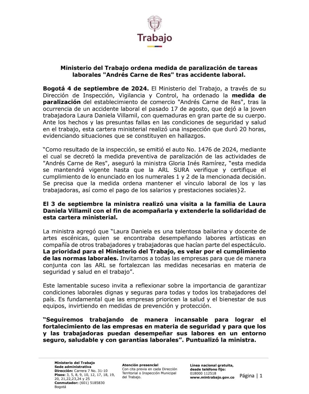 La decisión del Ministerio, que se basa en una exhaustiva inspección de 20 horas, derivó en la decisión de cerrar las puertas del establecimiento comercial de manera temporal hasta que se hallen soluciones que garanticen atención digna a la plantilla de trabajadores. Según el auto No. 1476 de 2024, emitido por la ministra Gloria Inés Ramírez, el restaurante permanecerá cerrado hasta que la ARL SURA certifique que se han implementado las correcciones necesarias.