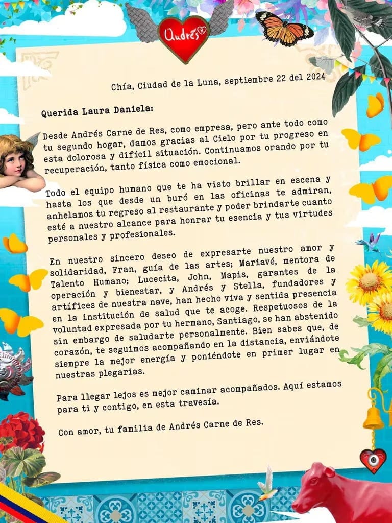 En una segunda carta pública desde que despertó de la sedación, el restaurante Andrés Carne de Res expresó su apoyo a Laura Daniela Villamil, la bailarina que sufrió graves quemaduras en un accidente en su sede de Chía, el pasado 17 de agosto.