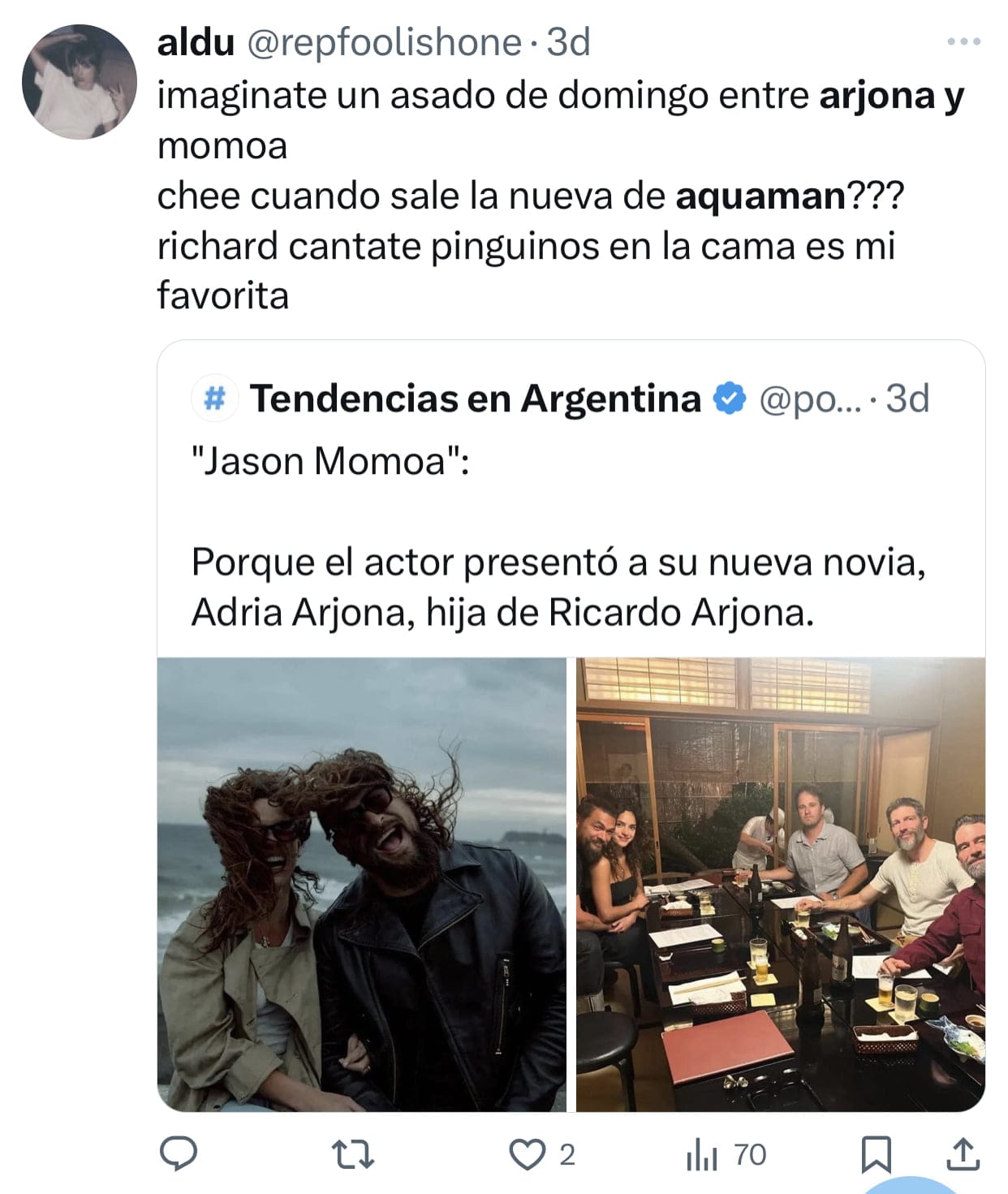Los memes por el nexo entre Momoa y Arjona no faltaron