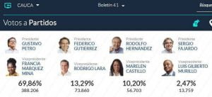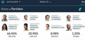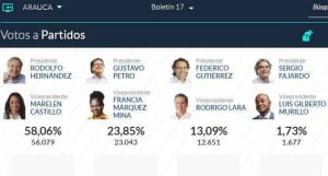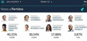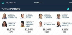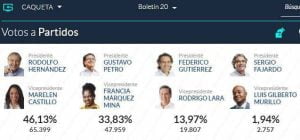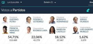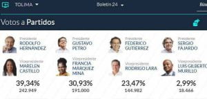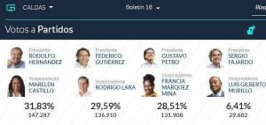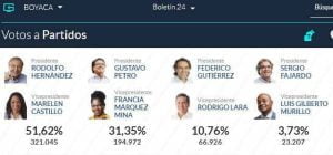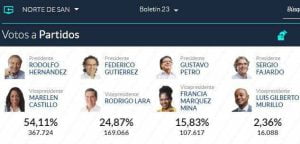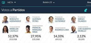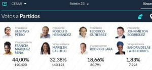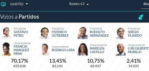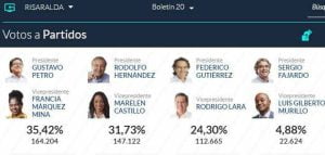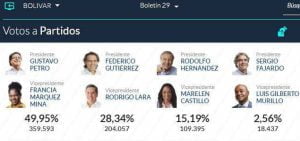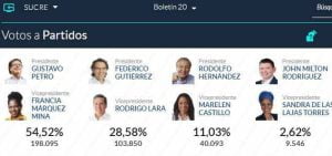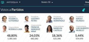 A nivel nacional, Petro quedó con una votación a favor de 8.527.768, lo que es igual al 40,32 %; mientras que Hernández obtuvo 5.953.209 votos que representan el 28,15%. Federico Gutiérrez, que en las encuestas de intención de fotos figuraba como uno de los aspirantes con más fuerza; recibió 5.058.010 que le dieron el 23,91% y esto no le alcanzó para seguir en la lucha para llegar a la Casa de Nariño.