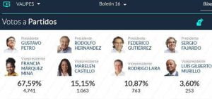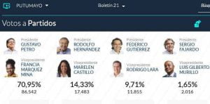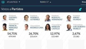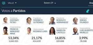 Según datos aportados por la Registraduría, en esta jornada hubo 21.146.287 votos válidos, de los cuales 20.779.664 los obtuvieron los candidatos; 29.715 quedaron como ‘no marcados’, 242.629 fueron nulos y 366.623 se dieron en blanco.