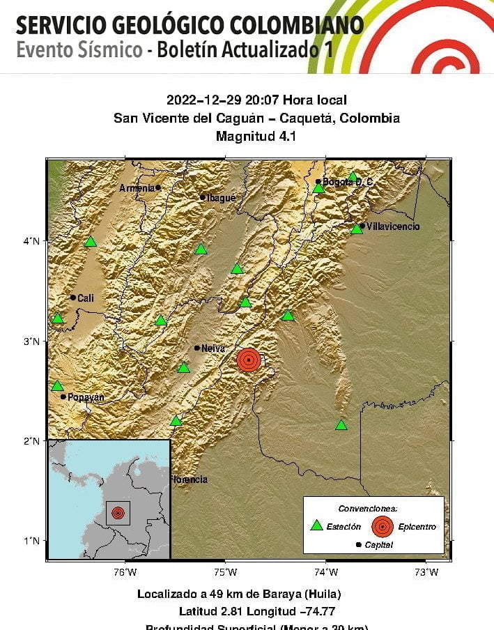 Así lo señaló el Servicio Geológico Colombiano, en su cuenta de Twitter: «Evento Sísmico – Boletín Actualizado 1, 2022-12-29, 20:07 hora local Magnitud 4.1, Profundidad Superficial (Menor a 30 km), San Vicente del Caguán – Caquetá, Colombia».