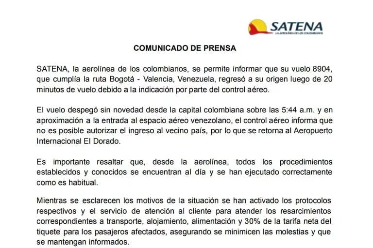 En un comunicación Satena informó que el avión volvió a su punto de despegue, porque no se le permitió el ingreso al espacio aéreo venezolano por razones que aún están siendo investigadas.