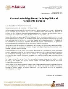 Andrés Manuel López Obrador, presidente de México, redactó un polémico comunicado en contra de los diputados del parlamento europeo; en cuyas líneas los llamó «borregos» y los invito a «informarse bien» antes de tomar decisiones.