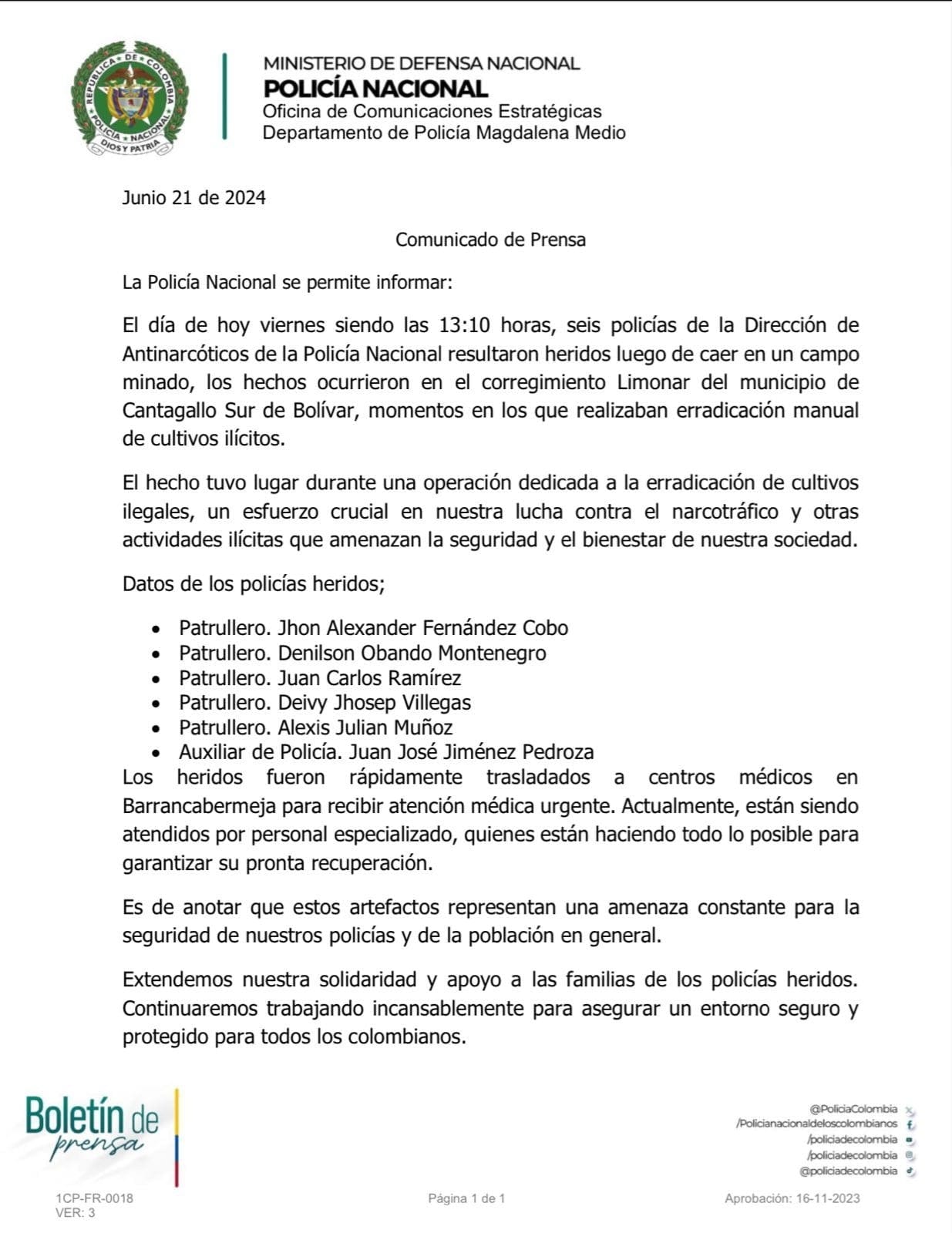 El parte oficial da cuenta de que el hecho se registró exactamente a las 11:10 de la mañana, en la frontera entre los municipios de Cantagallo y San Pablo, en momentos en los que los uniformados cumplían con erradicación manual de cultivos ilícitos.
