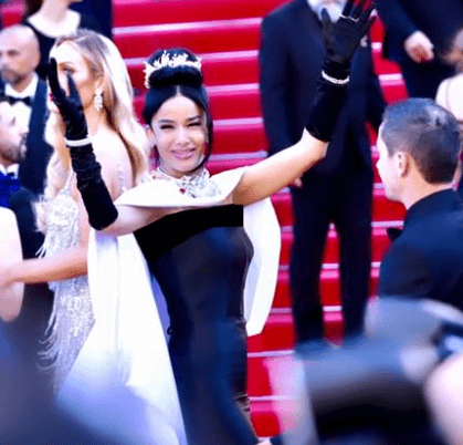 Ella llegó al evento llevando un vestido negro con un cola gigante de color blanco, es la que estaba pintado el rostro de Jesucristo con una corona de espinas sobre la cabeza. La joven tuvo un impase con los encargados de la seguridad, pero no está claro si el mismo tuvo algo que ver con el sentido religioso de su traje.