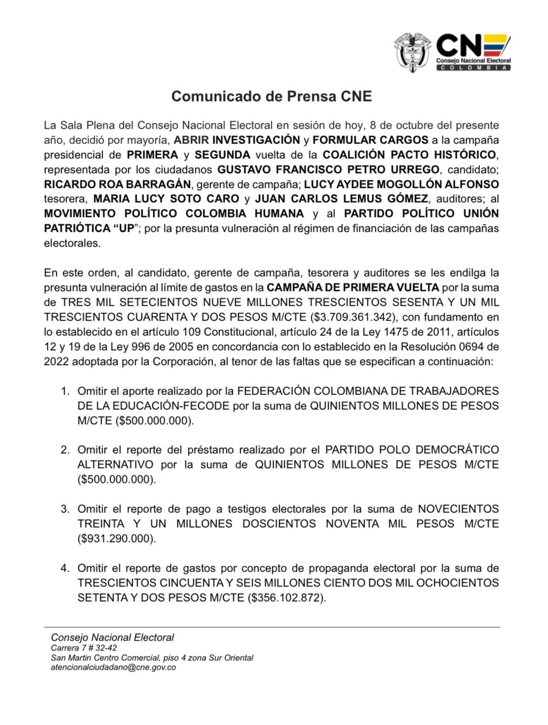 El CNE señaló que la campaña habría excedido los topes de gastos permitidos en más de $3.709 millones durante la primera vuelta, y en $1.646 millones en la segunda. Entre las irregularidades más destacadas se encuentra la omisión del reporte de aportes significativos, como los $500 millones provenientes de la Federación Colombiana de Trabajadores de la Educación (Fecode), y la falta de registro de pagos a testigos electorales por casi $1.109 millones.