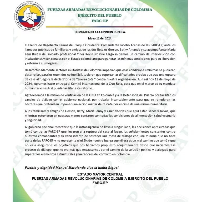 También instaron al presidente a cumplir con lo que se había acordado para avanzar en los «procesos conjuntos» entre la disidencia y el Gobierno. “No era más que encausarnos por el camino de la solución política y dialogada para superar los elementos estructurales generadores del conflicto en Colombia”, señalaron.