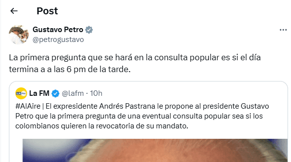 En medio del debate sobre las reformas a la salud y laboral, el presidente Gustavo Petro reveló este 14 de marzo la primera pregunta que hará parte de la consulta popular que pretende convocar: “¿El día termina a las 6 pm de la tarde?” (sic). Esta iniciativa busca que la ciudadanía se pronuncie sobre el futuro de los proyectos impulsados por su gobierno, especialmente la reforma laboral, que enfrenta un posible hundimiento luego de que ocho senadores respaldaran su archivo en la Comisión Séptima del Senado.