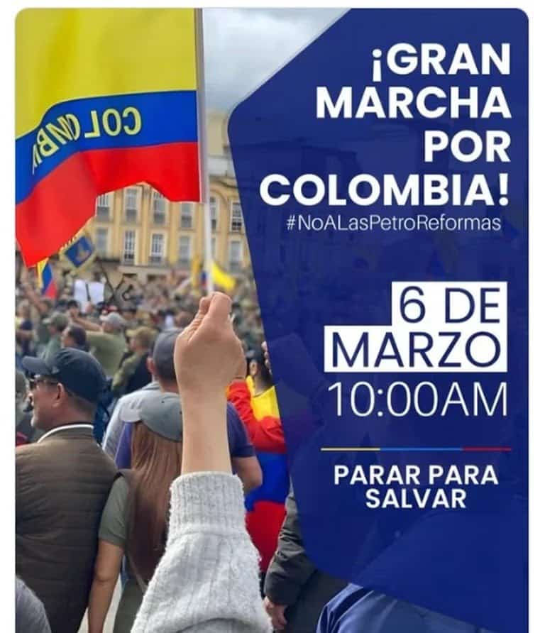 La oposición al Gobierno de Gustavo Petro anunció que para el próximo 6 de marzo se tiene prevista una nueva movilización de calle para rechazar algunas de las políticas que la administración ha venido implementado, y también las que planea poner en práctica en un futuro próximo.