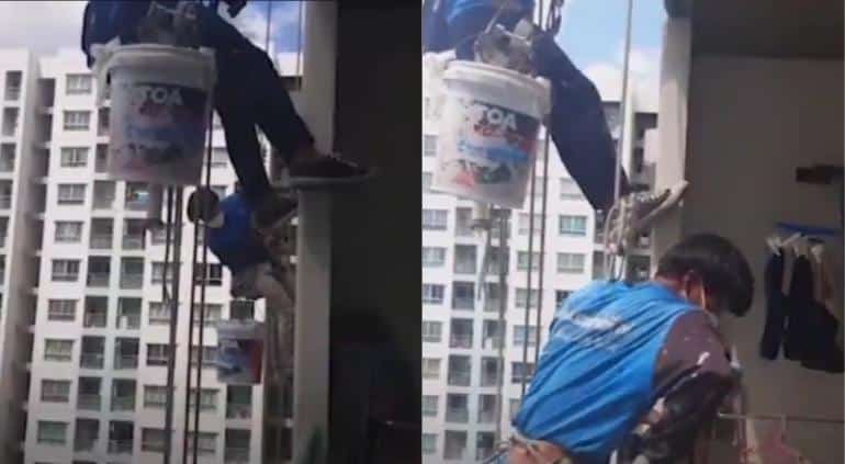 La vecina de un edificio de apartamentos en Tailandia casi provoca una tragedia cuando cortó las cuerdas de seguridad de trabajadores que pintaban una fachada.