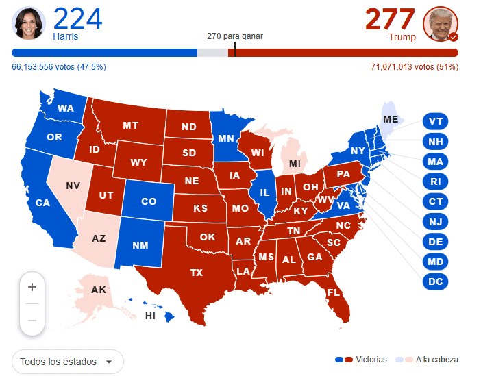 Donald Trump ha ganado las elecciones presidenciales de Estados Unidos al superar los 270 votos necesarios en el Colegio Electoral, logrando hasta ahora 277, con la posibilidad de alcanzar 312 porque aún faltan un par de estados por revelar sus resultados.