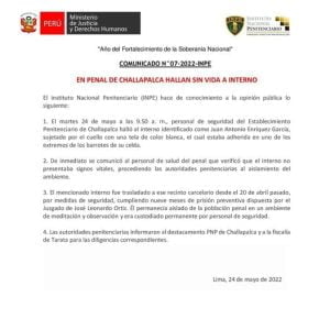 El Instituto Nacional Penitenciario (INPE) de Perú, informó que su cuerpo estaba “sujetado por el cuello con una tela de color blanca, el cual estaba adherida en uno de los extremos de los barrotes de su celda”, ubicada en el Establecimiento Penitenciario de Challapalca; y que el hallazgo se produjo en horas de la mañana de este martes, 24 de mayo.