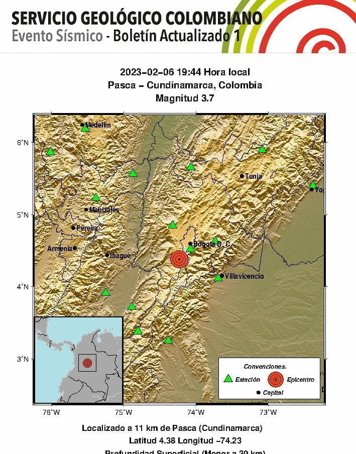 Así lo señaló el Servicio Geológico Colombiano, en su cuenta de Twitter: «Evento Sísmico – Boletín Actualizado 1, 2023-02-06, 19:44 hora local Magnitud 3.7, Profundidad Superficial (Menor a 30 km), Pasca – Cundinamarca, Colombia».