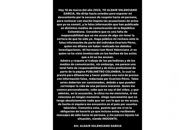 “Considero que es una falta de responsabilidad que se me acuse de algo sin tener la certeza de que he sido yo. Hago público mi rechazo ante la falta de información… Mi hermano Iván René Valenciano Jr. es quien se ha visto involucrado en los hechos de los actos que a mí se me acusan”, escribió en su cuenta de Instagram.