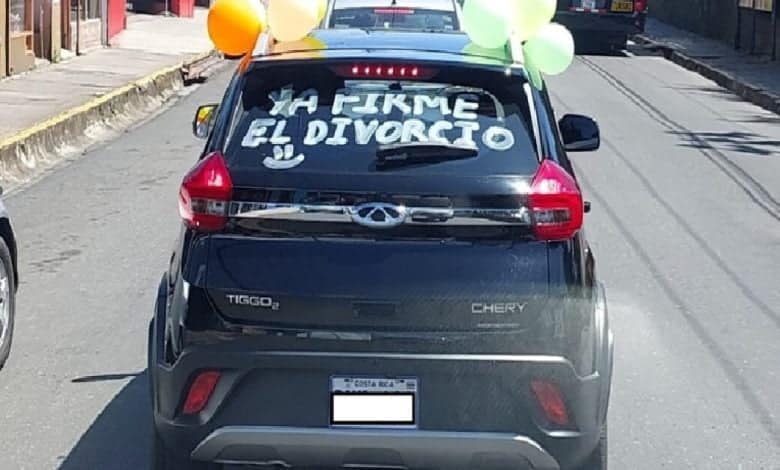 «Ya firmé el divorcio», se lee en el vidrio de la parte trasera del automóvil de color negro, que a ambos lados llevaba globos de colores pasteles. Con esa decoración el sujeto fue a la Basílica de Nuestra Señora de los Ángeles para agradecer a Dios, y luego al cementerio para ‘contarle’ la buena noticia a su madre fallecida.