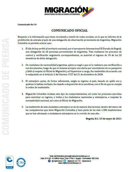 Migración Colombia asegura que el ciudadano argentino llegó al país con una delegación de 19 personas más.