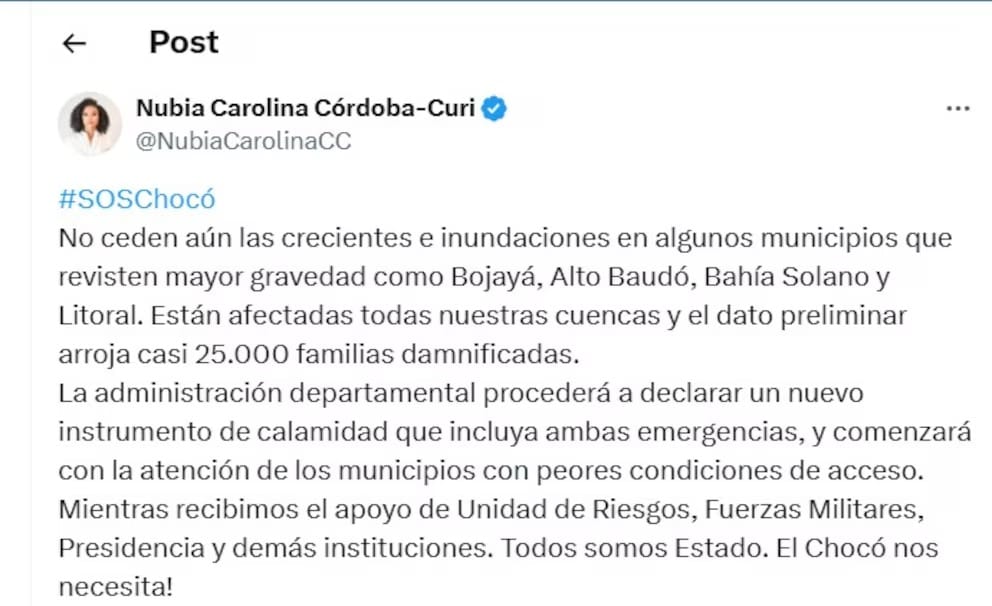 La gobernadora del Chocó, Nubia Carolina Córdoba, anunció que el departamento declarará un estado de calamidad que abarque tanto la emergencia por lluvias como las restricciones de movilidad.