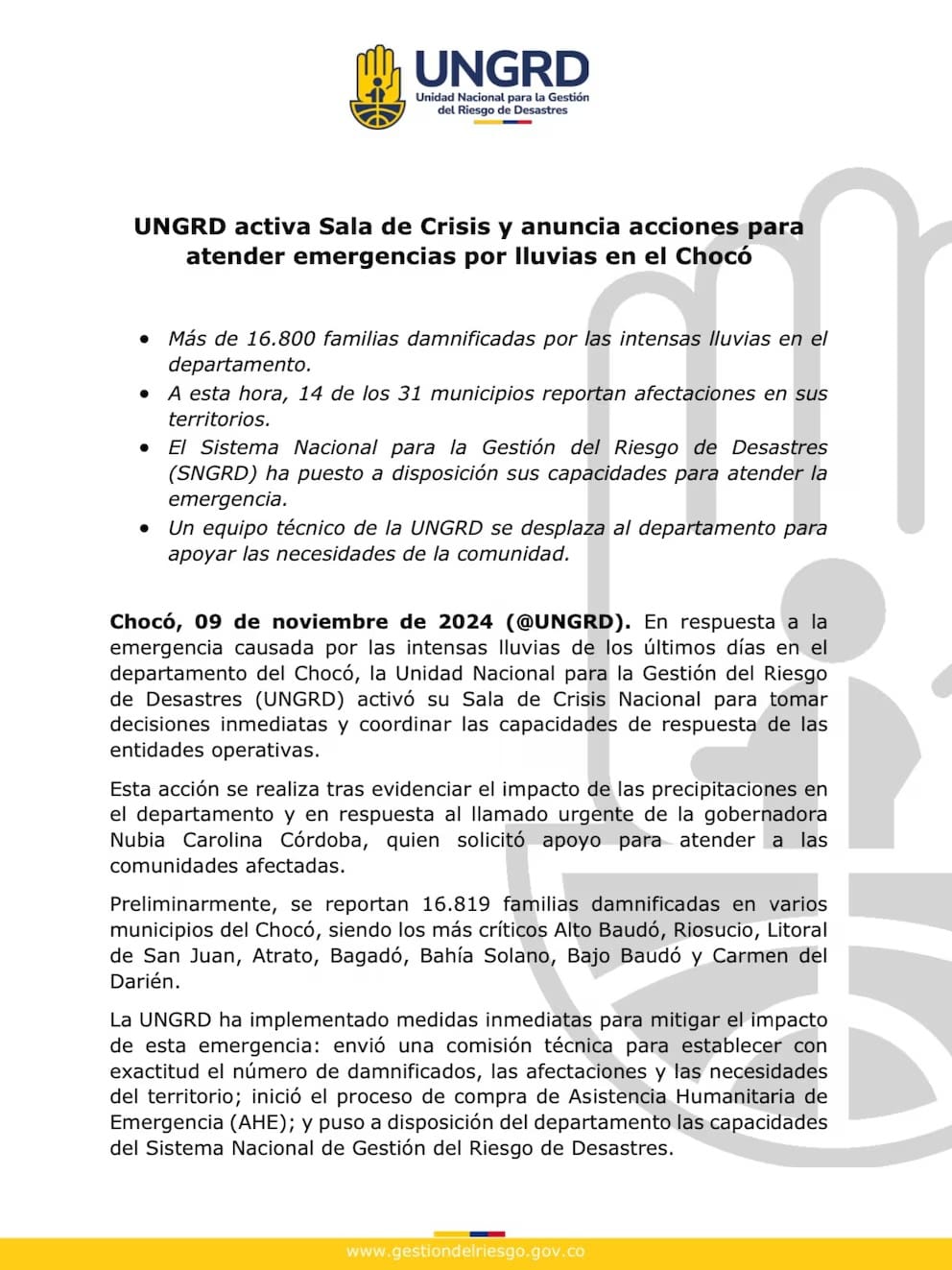 En respuesta, la UNGRD y las autoridades locales trabajan en la habilitación de un corredor humanitario seguro que permita el ingreso de ayuda a las comunidades damnificadas en las riberas de los ríos San Juan, Sipí y Cajón.