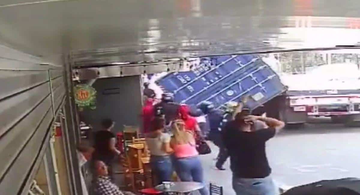 Una cámara de seguridad captó el inquietante momento en el que por pocos segundos un motociclista se salvó de terminar aplastado por un gigante contenedor que se desprendió de la tractomula que lo transportaba.