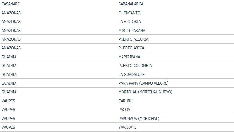 “Dichos municipios corresponden a; 11 en Boyacá, 5 en Guainía, 5 en Amazonas, 4 en Vaupés, 4 en Santander, 4 en Cundinamarca, 3 en Chocó y 1 en Casanare”.