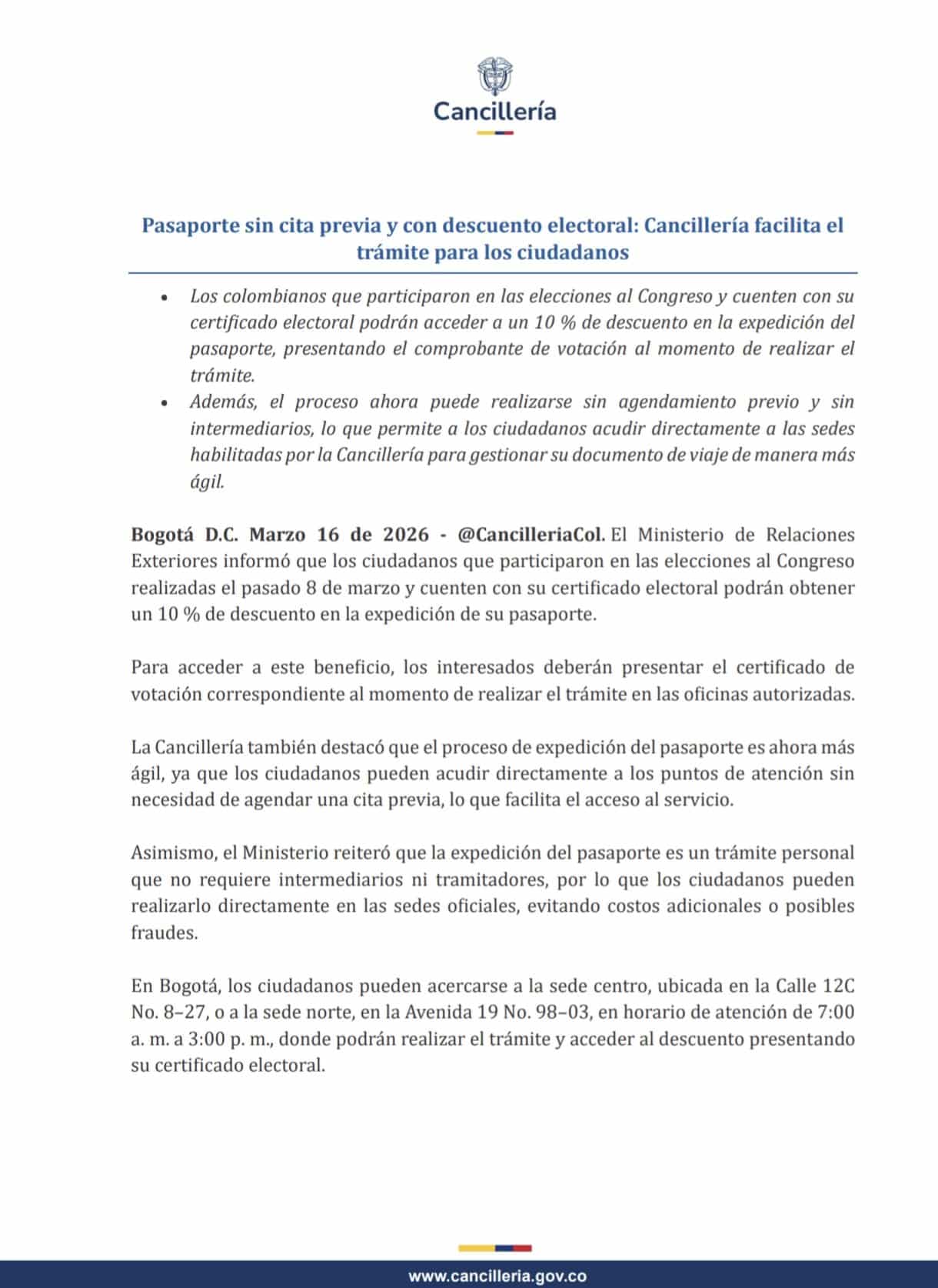 La medida establece que los colombianos que ejercieron su derecho al voto en los comicios al Congreso del pasado 8 de marzo podrán acceder a un descuento del 10 % en la expedición del pasaporte, siempre y cuando presenten el certificado electoral al momento de realizar el trámite.
