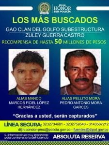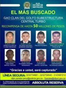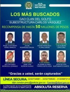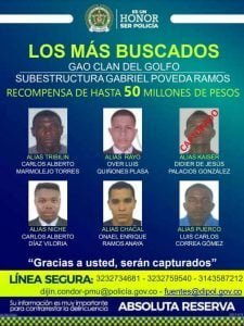 “Hay más de 1.700 órdenes de capturas con las que los estamos buscando, sobre todo están en las zonas rurales. Han sido dos días muy positivos en la lucha contra el narcotráfico y en la lucha contra el Clan del Golfo”, dijo el general Jorge Luis Vargas, director de la Policía Nacional.