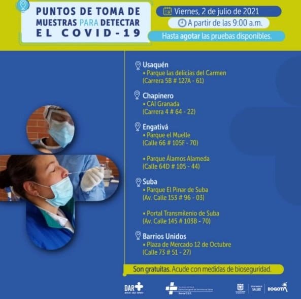 Estos son los puntos para pruebas gratuitas de COVID-19 en Bogotá, los cuales estarán habilitados desde las 9 de la mañana.