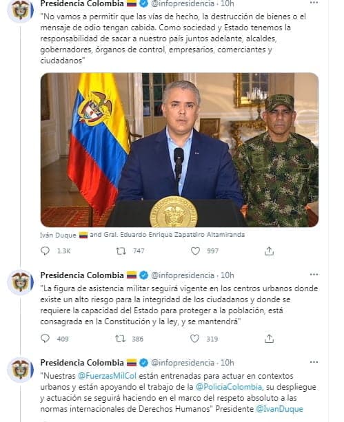 Este sábado, el presidente Iván Duque anunció que acudirá a la figura de asistencia militar, tras la cuarta jornada de protesta en el país. “Mi obligación como Presidente es garantizar el derecho a la protesta pacífica, pero sobre todo garantizar la seguridad de conciudadanos”, dijo el mandatario.