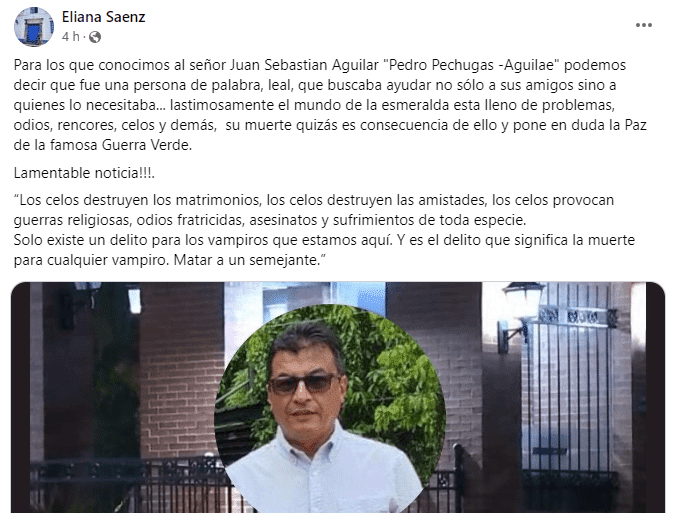 Dichas palabras las dijo una usuaria de Facebook identificada como Eliana Sáenz, quien además aseguró que este esmeraldero corrió con la misma suerte que muchos otros de su oficio, pues «lastimosamente el mundo de la esmeralda esta lleno de problemas, odios, rencores, celos y demás».