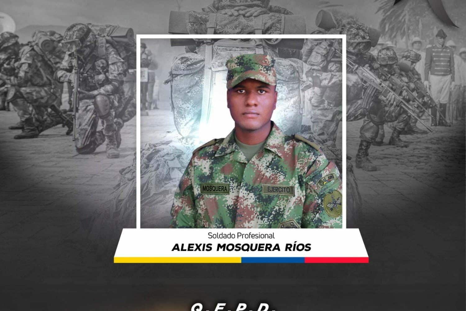 “Producto de esta acción criminal fue asesinado nuestro soldado profesional Alexis Mosquera Ríos, quien servía en defensa de la población civil desde hacía dos años en el Ejército Nacional”, agrega.