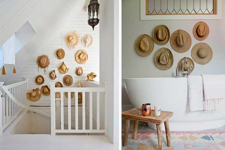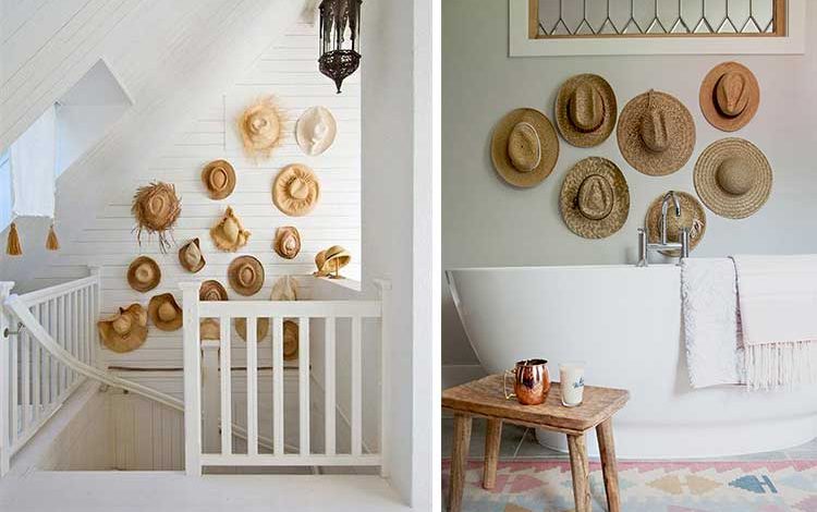 Si tiene a la mano algunos sombreros de paja viejos, nada más fácil que colgarlos en la pared. Preste atención a la distribución: si la pared es más alta que ancha, utilice la verticalidad.