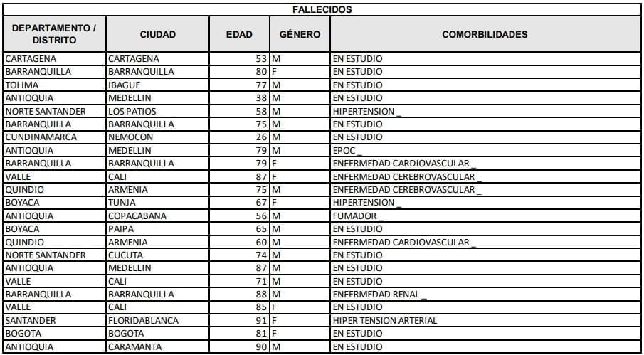 Las cifras de este reporte diario de coronavirus, se suman al reporte oficial de totales, desde el inicio de la pandemia de COVID-19 en Colombia, así: