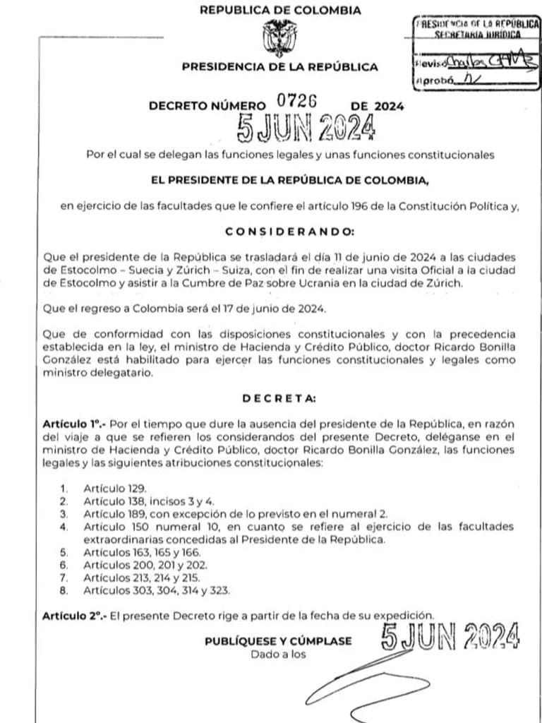 «Describe las funciones generales del presidente de la República, excepto la función de comandar la fuerza pública en calidad de comandante supremo. Ricardo Bonilla ejercerá las otras funciones que incluyen la dirección del Gobierno y la administración general del país», se lee en el decreto.