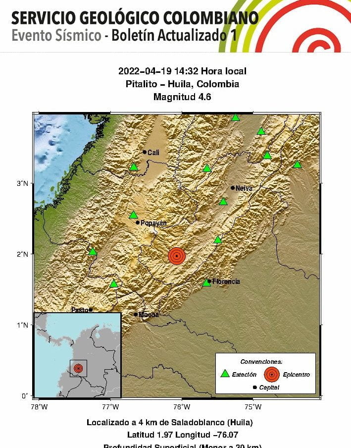 Así lo señaló el Servicio Geológico Colombiano, en su cuenta de Twitter. «Servicio Geológico @sgcol. #SismosColombiaSGC Evento Sísmico – Boletín Actualizado 1, 2022-04-19, 14:32 hora local Magnitud 4.6, Profundidad Superficial (Menor a 30 km), Pitalito – Huila, Colombia ¿Sintió este sismo? repórtelo», señaló la entidad.