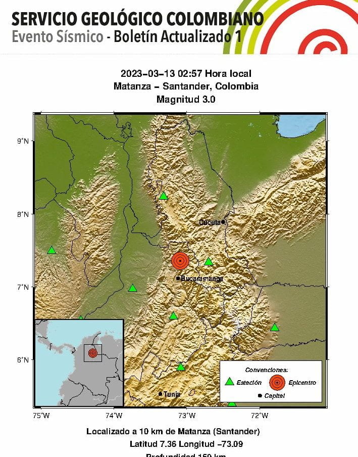 «Evento Sísmico – Boletín Actualizado 1, 2023-03-13, 02:57 hora local Magnitud 3.0, Profundidad 159 km, Matanza – Santander, Colombia».