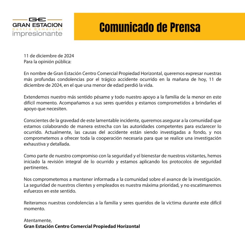 El local involucrado, GEF, cerró sus puertas tras el incidente y colocó vallas en la zona. La administración del centro comercial expresó su profundo pesar y aseguró estar colaborando con las autoridades para esclarecer lo sucedido. En un comunicado, destacaron su compromiso con la seguridad de los visitantes y el apoyo a la familia de la víctima. Además, informaron que ya se activaron protocolos para prevenir futuros incidentes y garantizar un entorno seguro.
