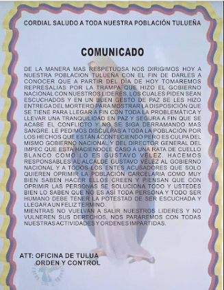 Pero también señalan que el INPEC y el Estado han decidido prestarle atención al alcalde Gustavo Vélez, a quien definen como “rata”, porque quiere “oprimir a la población carcelaria”.  “Mientras no vuelvan a salir nuestros líderes y nos vulneren sus derechos, no pararemos con todas nuestras actividades y órdenes impartidas”, finaliza el comunicado.