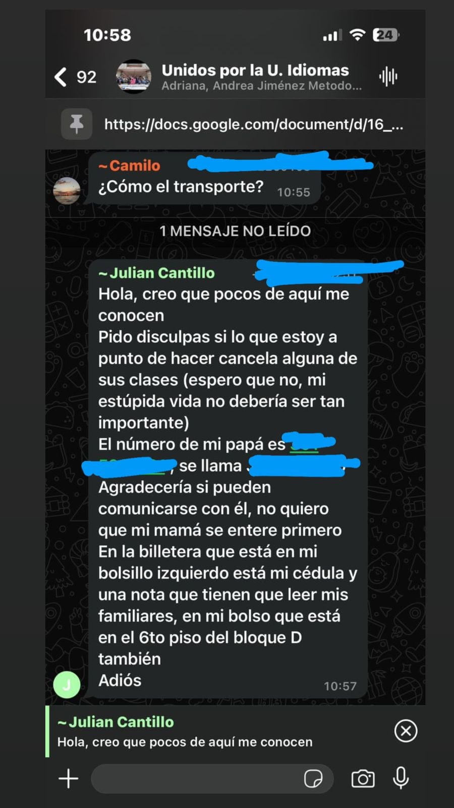 «Hola, creo que pocos aquí me conoce. Pido disculpas si lo que estoy a punto de hacer cancela alguna de sus clases (espero que no, mi estúpida vida no debería ser tan importante). El número de mi papá es xxxxxxx, se llama Julio Cantillo. Agradecería si pueden comunicarse con él, no quiero que mi mamá se entere primero». Este fue el mensaje que Julián Cantillo envió al grupo de WhastApp de los estudiantes del programa de Lenguas Extranjeras de la Universidad del Atlántico, antes de quitarse la vida.