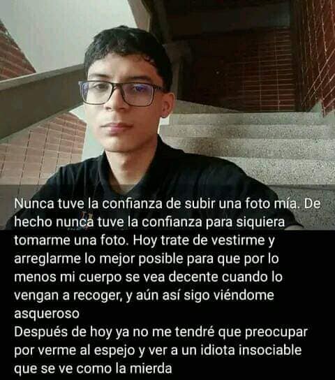 En un segundo mensaje que al parecer compartió en sus estados de WhatsApp, el jovencito manifestó: “Nunca tuve la confianza de subir una foto mía. De hecho nunca tuve la confianza para siquiera tomarme una foto. Hoy traté de vestirme y arreglarme lo mejor posible para que por lo menos mi cuerpo se vea decente cuando lo vengan a recoger, y aún así sigo viéndome asqueroso. Después de hoy ya no me tendré que preocupar por verme al espejo y ver a un idiota insosiable que se ve como la mi#rd@”.