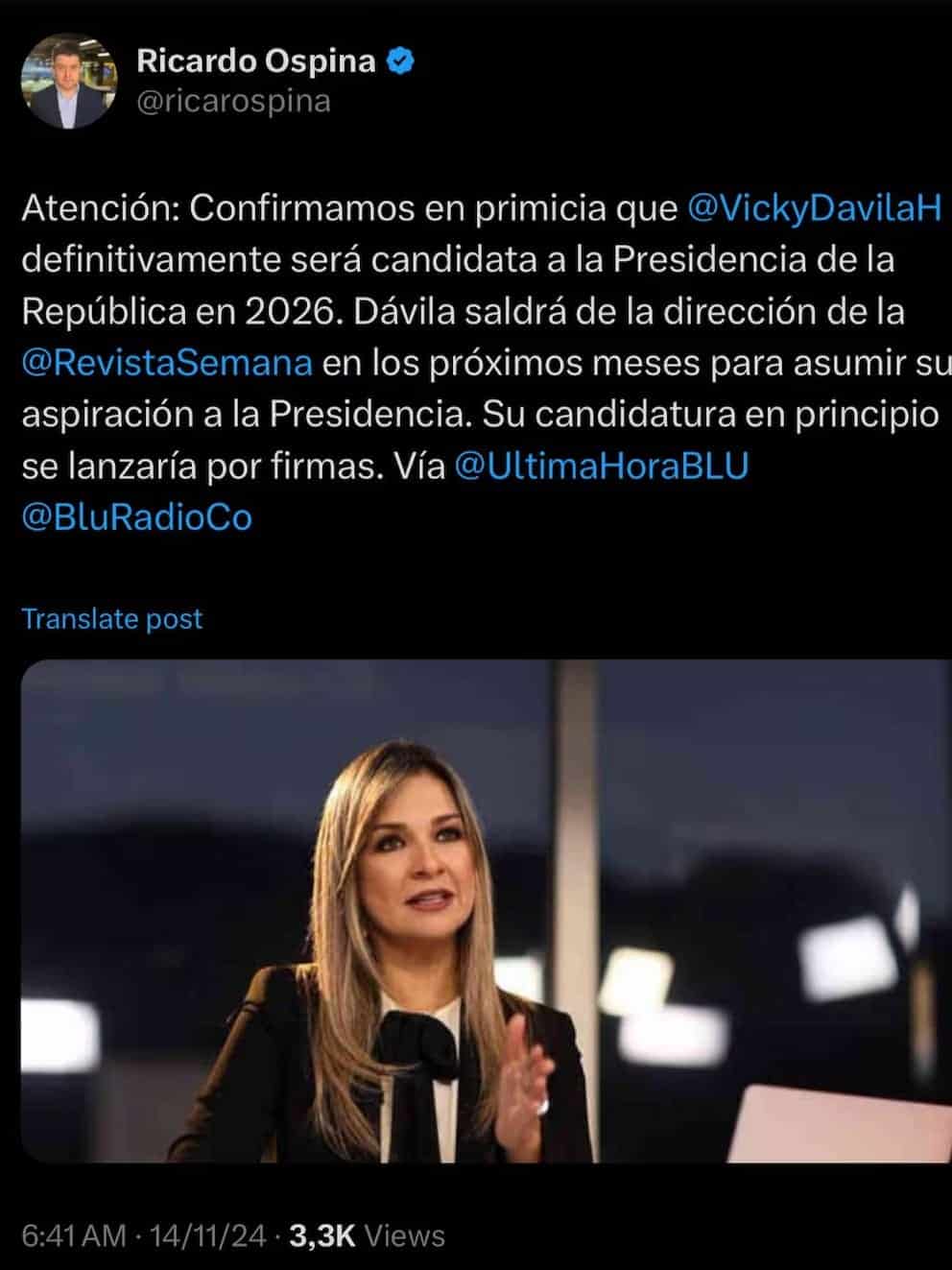 La reconocida periodista Vicky Dávila, renunció a su cargo como directora de la revista Semana, pues se postulará a la Presidencia de Colombia en 2026.