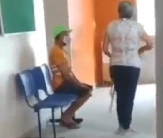 En el video se puede ver al hombre sentado en una silla, amarrado con una cuerda de varios metros amarrada a su cuerpo. Por su parte, su esposa lo agarra de la soga, y se mantiene de pie, esperando el turno para que le pongan la vacuna contra el COVID-19 a su esposo.