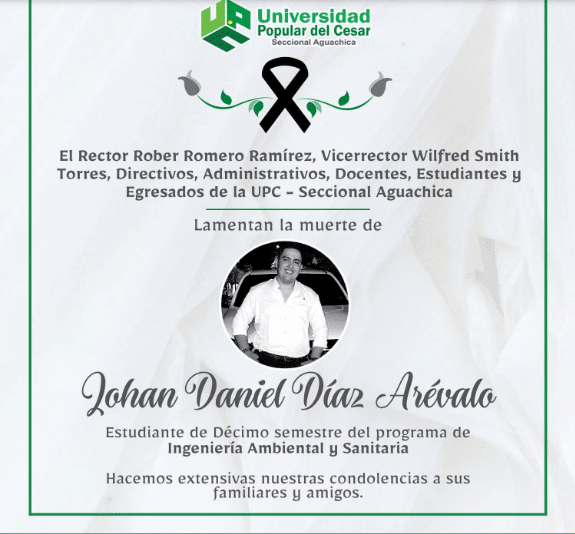 Además de su pasión por el vallenato, Johan Daniel estudiaba la carrera de Ingeniería Ambiental y Sanitaria. La casa de estudios emitió un obituario por la irreparable pérdida y envió palabras de condolencia a familiares, amigos, compañeros de estudio y demás allegados que sufren el duelo.