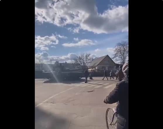 En el video se puede ver como el tanque entra a Bakhham en Chernígov y un hombre salta frente al vehículo y con brazos y piernas intenta detenerlo; el conductor se detiene, mientras el ciudadano se arrodilla y alza los brazos, al ver esto otras personas lo quitan para evitar que pase algún accidente.
