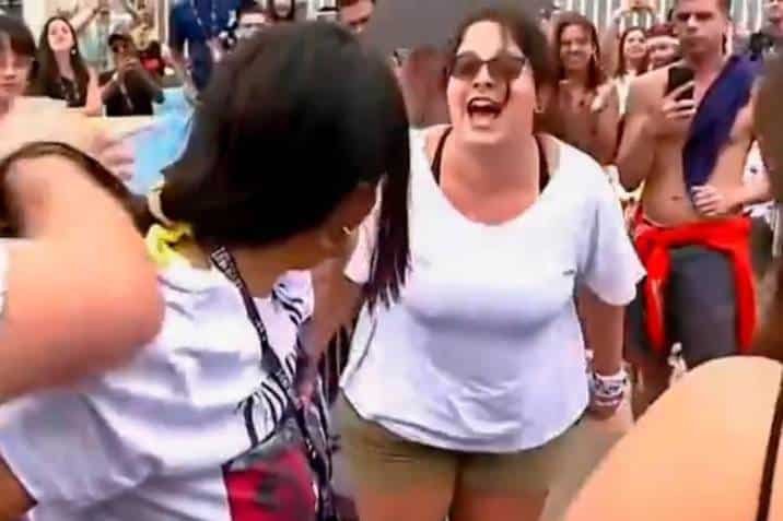 En las imágenes una mujer, natal de Brasil, le reclama en portugués a la joven colombiana que estaba sentada en el suelo dentro de los vallas reglamentarias, porque presuntamente se voló el lugar en la fila para quedar antes y lograr un mejor puesto dentro del recinto.